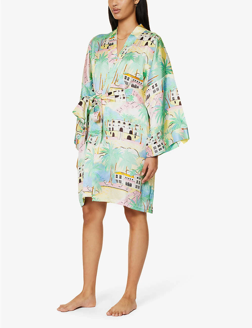 - Relaxed fit, shawl neck, dropped shoulders, short sleeves, belt loops, self-tie belt, all-over graphic design, satin finish