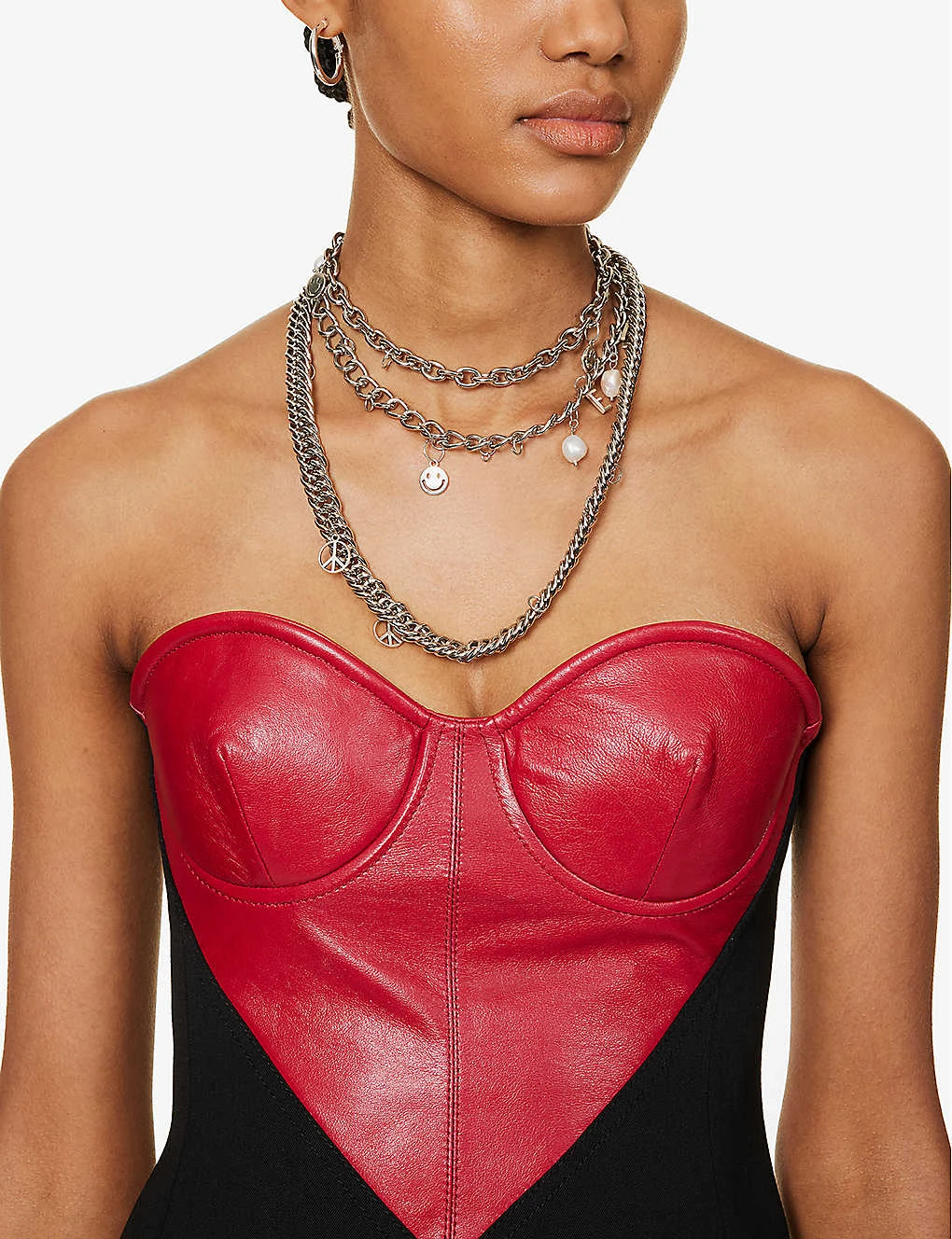 - Slim fit, sweetheart neckline, strapless, underwired cups, contrast heart panel at front, wide belt loops, silver-toned buttons at front, box-pleat hem, lined