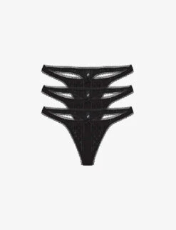 - Fitted, mid rise, all-over fine knit, V-string at back, lace trims, lined gusset