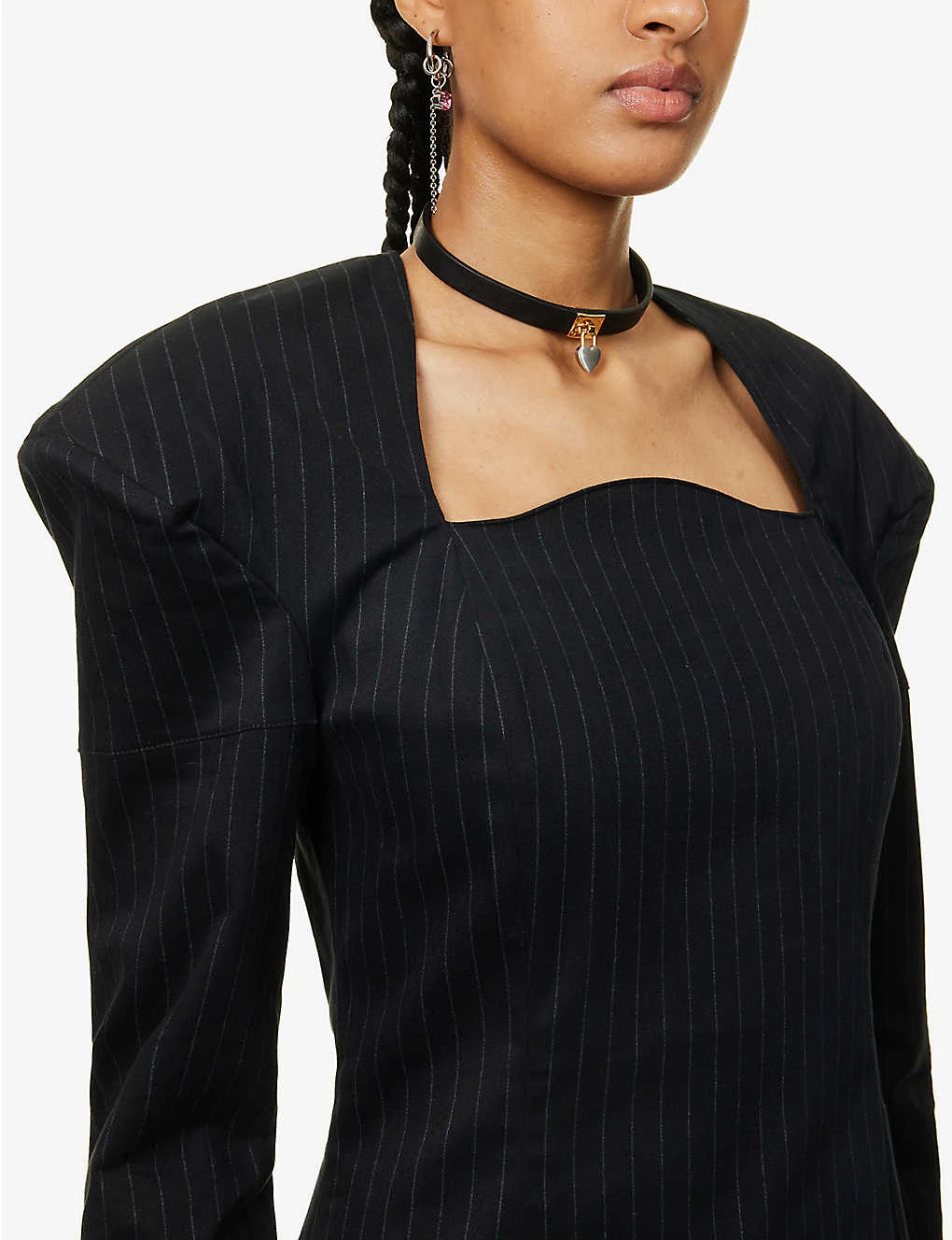 - Regular fit, square neckline, padded shoulders, long sleeves, darts at back, all-over stripe pattern, A-line silhouette