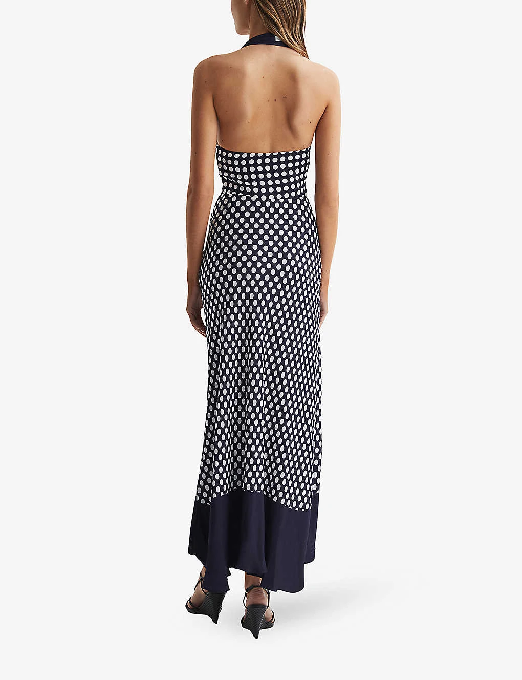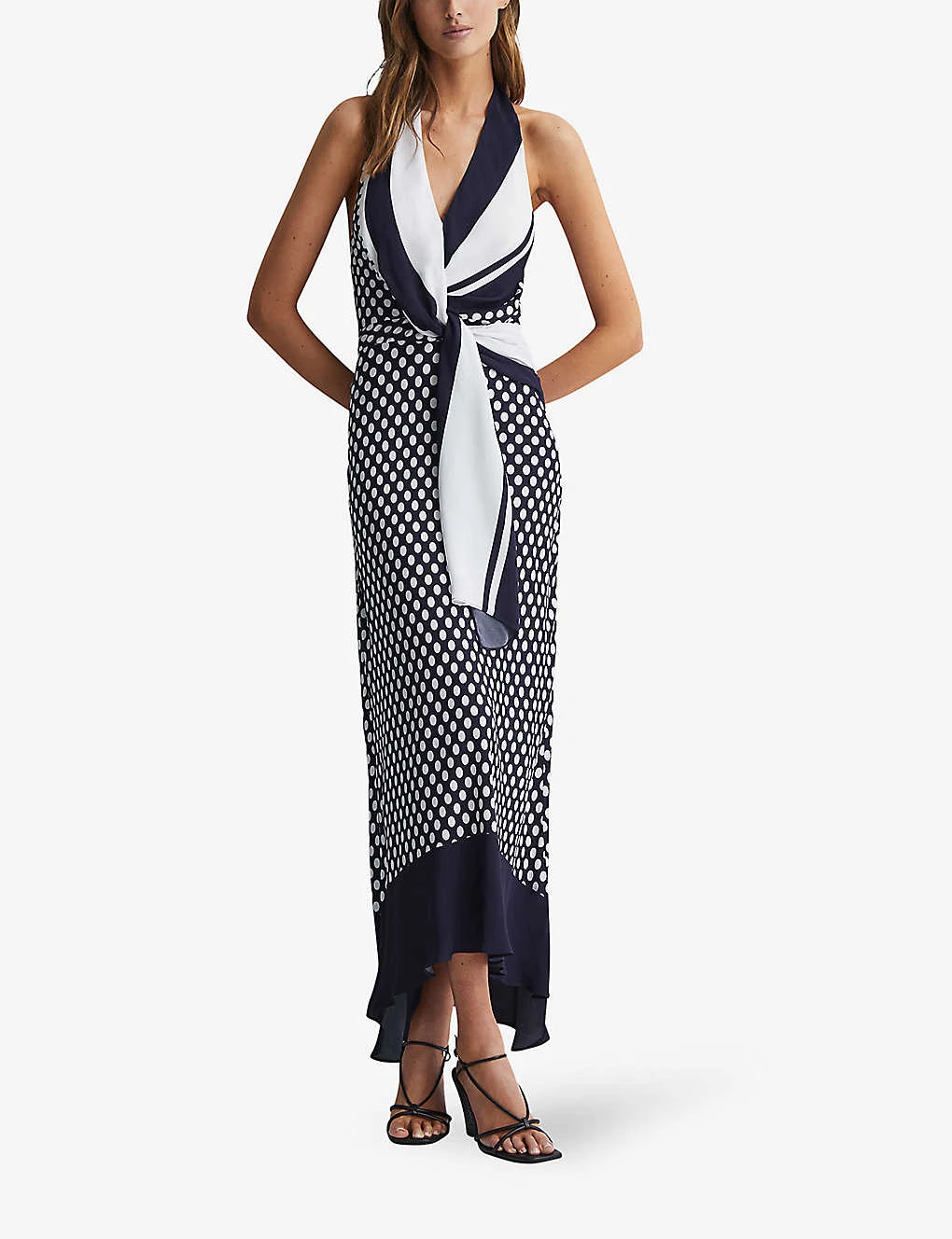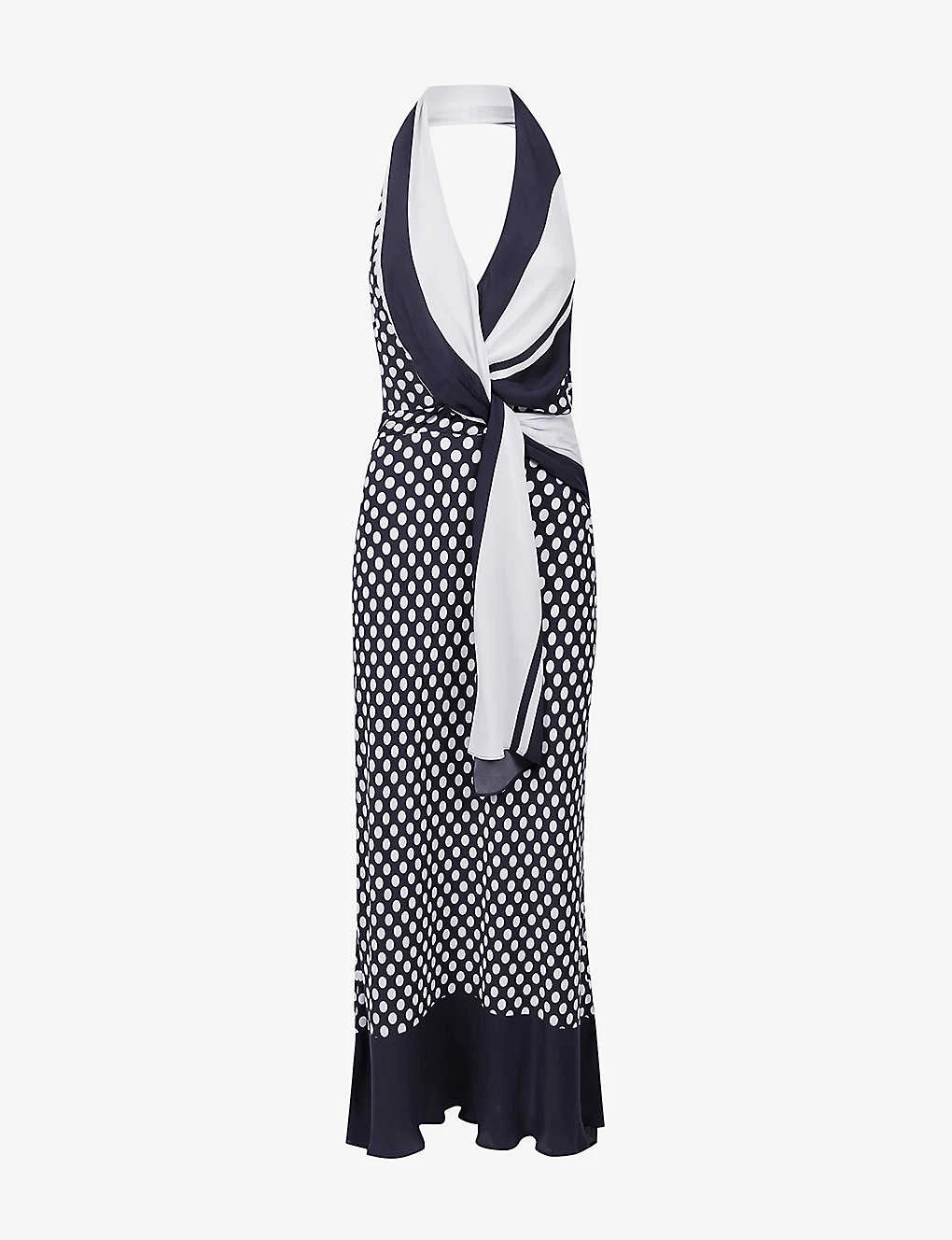 - Halter neck, V-neckline, sleeveless, polka-dot print throughout, maxi length, tie-detail