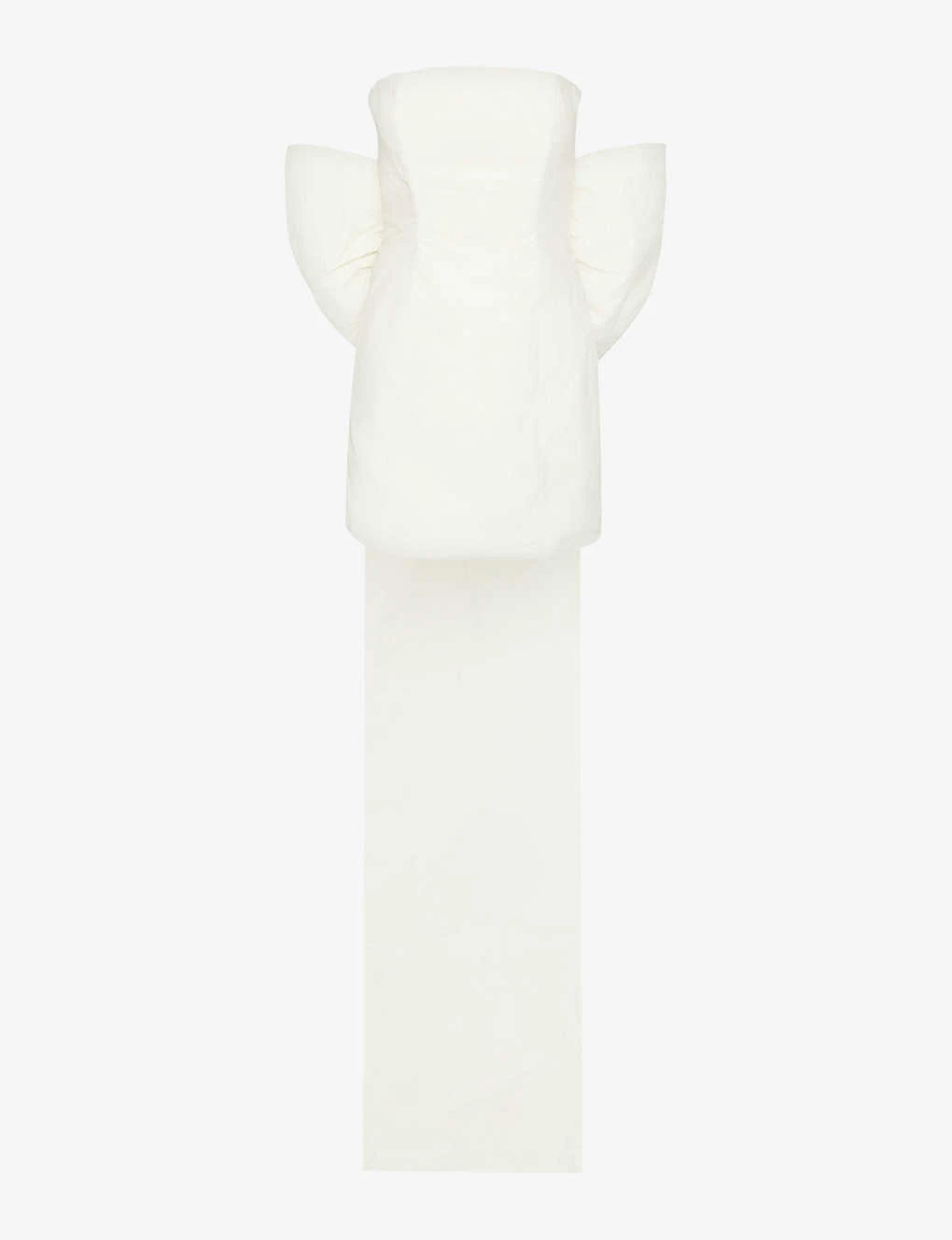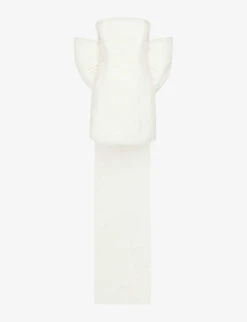 - Slim fit, curved neckline, sleeveless, strapless, darts at front and back, bow embellishment at back, fully lined, straight hem
