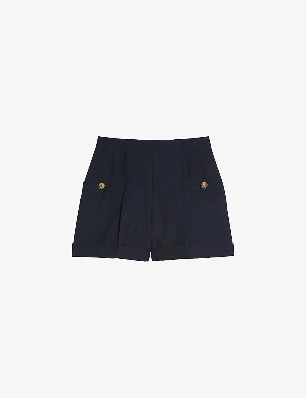 High waisted short design, hip pockets with gold-coloured buttons, darts at the waist, front and back, turn-ups at the hems