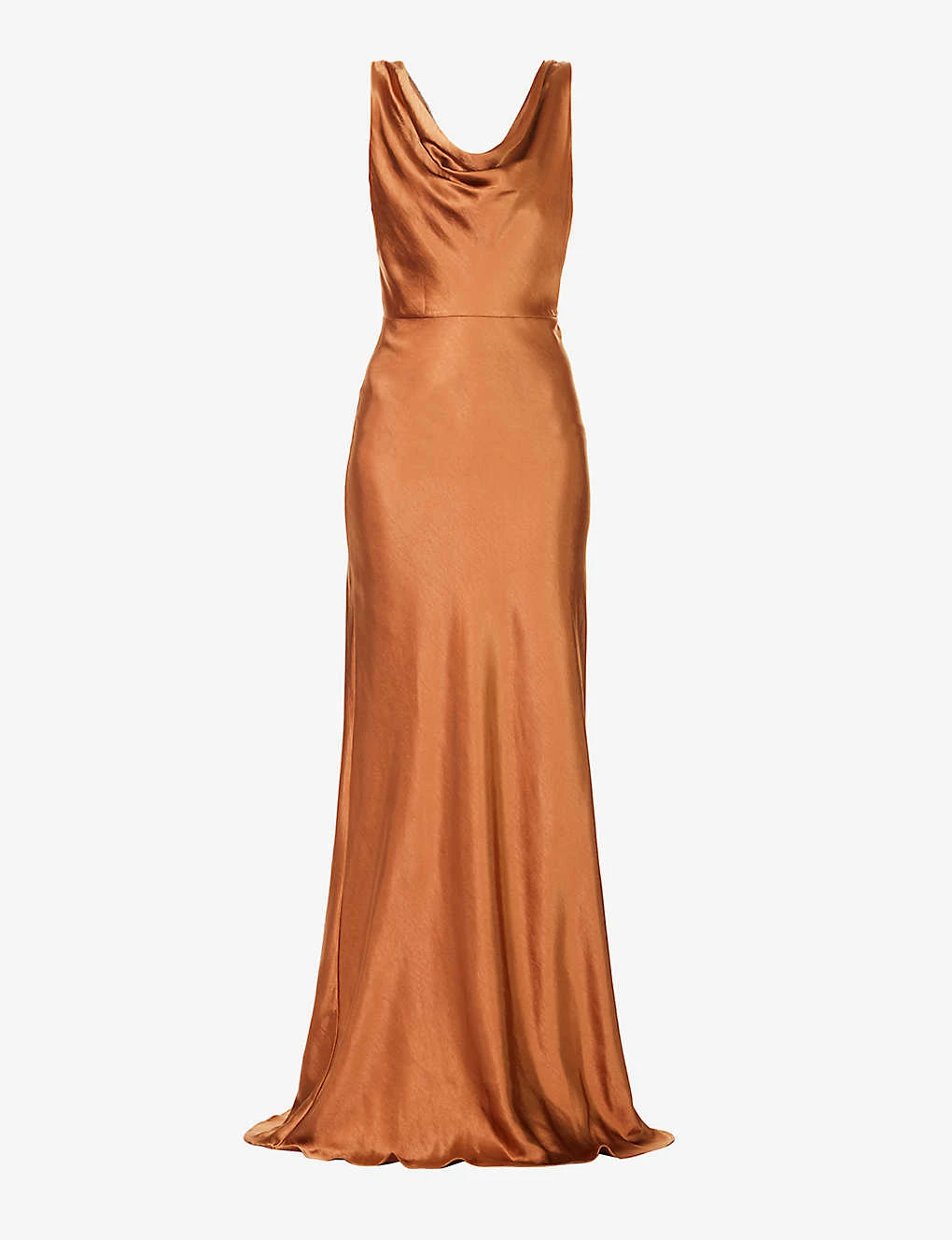 - Slim fit, cowl neckline, sleeveless, darts at back, flared hem