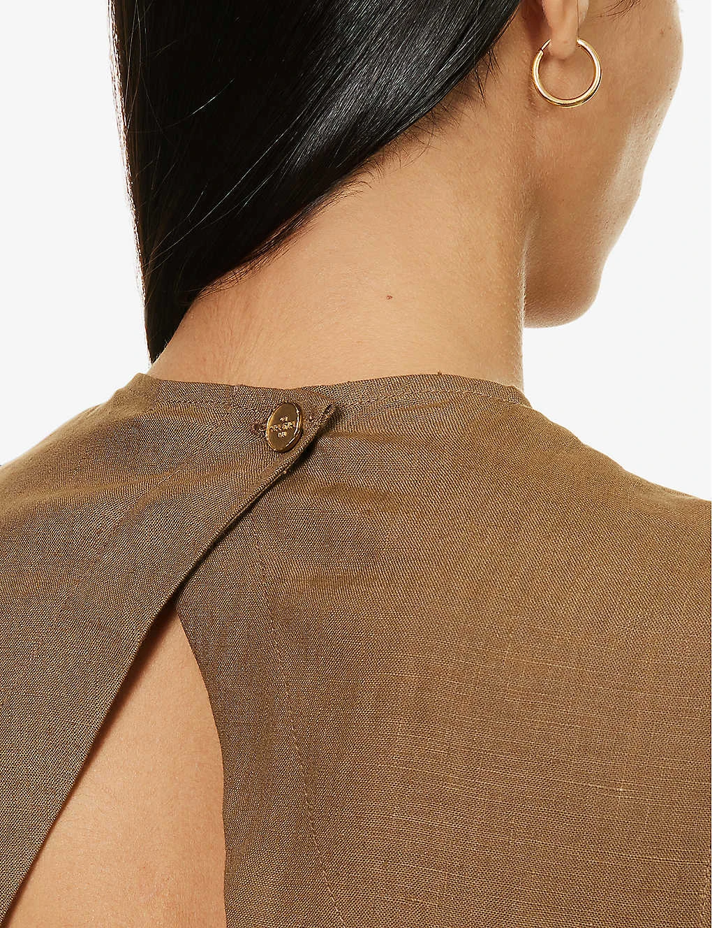 - Regular-fit, scoop neck, sleeveless, darts at chest, open back, gold-toned buttons, high splits at sides, open back, elasticated strap at back
