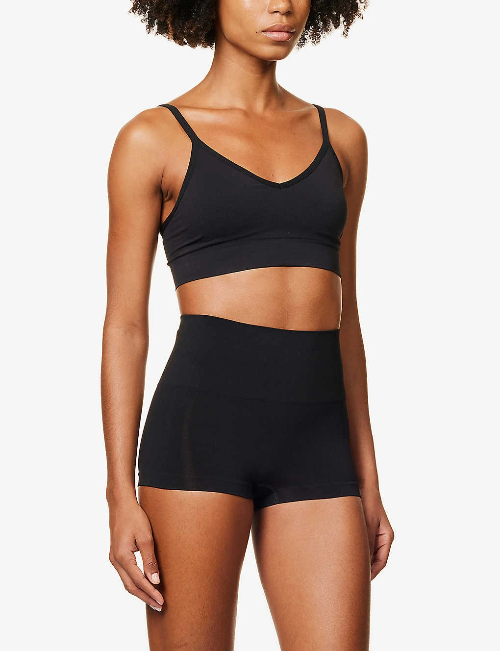 - High-rise, elasticated waistband, seamless, full-coverage at back, lined gusset