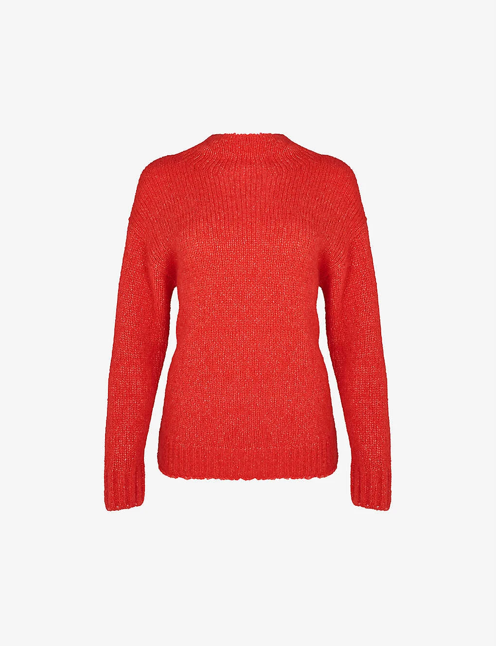 - Funnel neck, dropped shoulders, long sleeves, ribbed cuffs, boxy fit, all-over brushed knit, ribbed hem