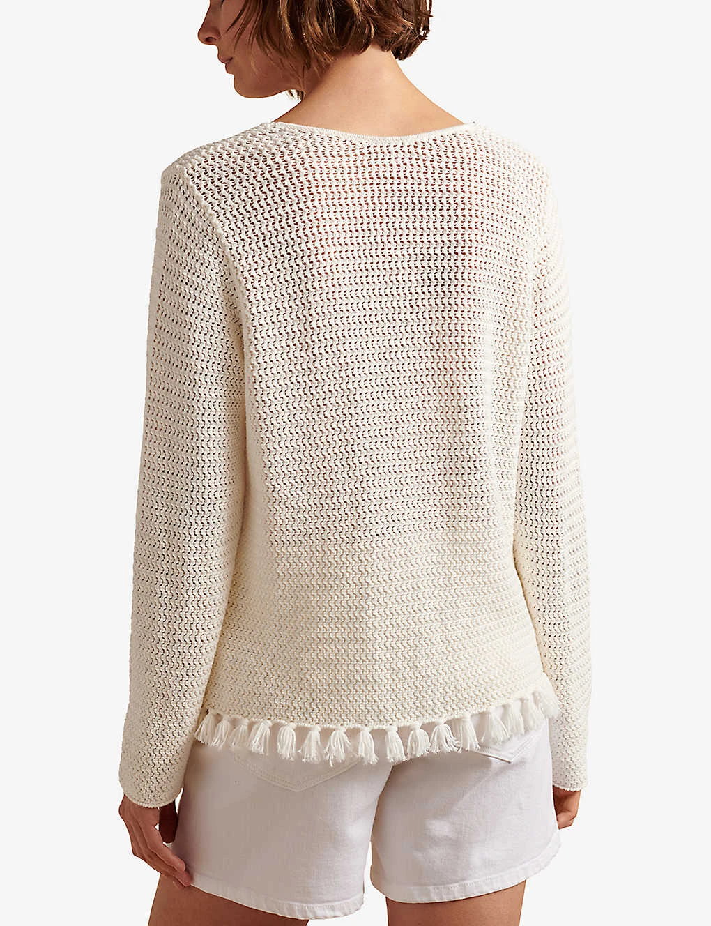 - V-neck, long sleeves, all-over crochet texture, tassel hem