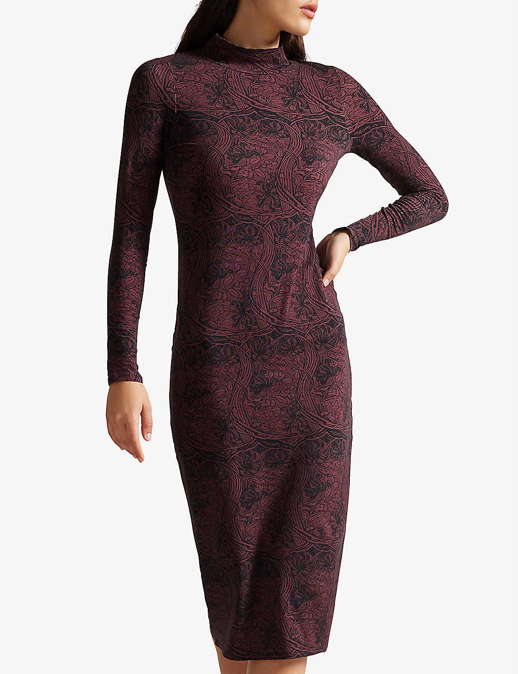 - Slim fit, high neck, long sleeves, all-over floral print, midi length, bodycon design