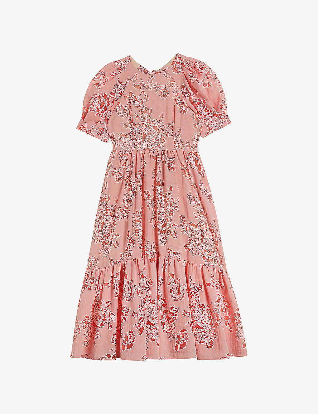 - Round neck, self-ties at back neck, short puff sleeves, fitted cuffs, all-over floral print, tiered panel design, fully lined