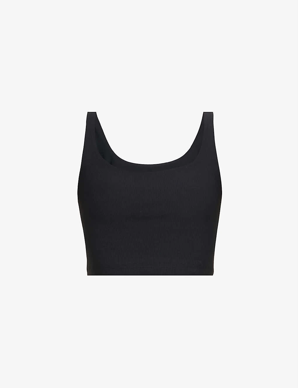 - Scoop neck, internal elasticated support, brand print at back, all-over ribbed texture, medium support