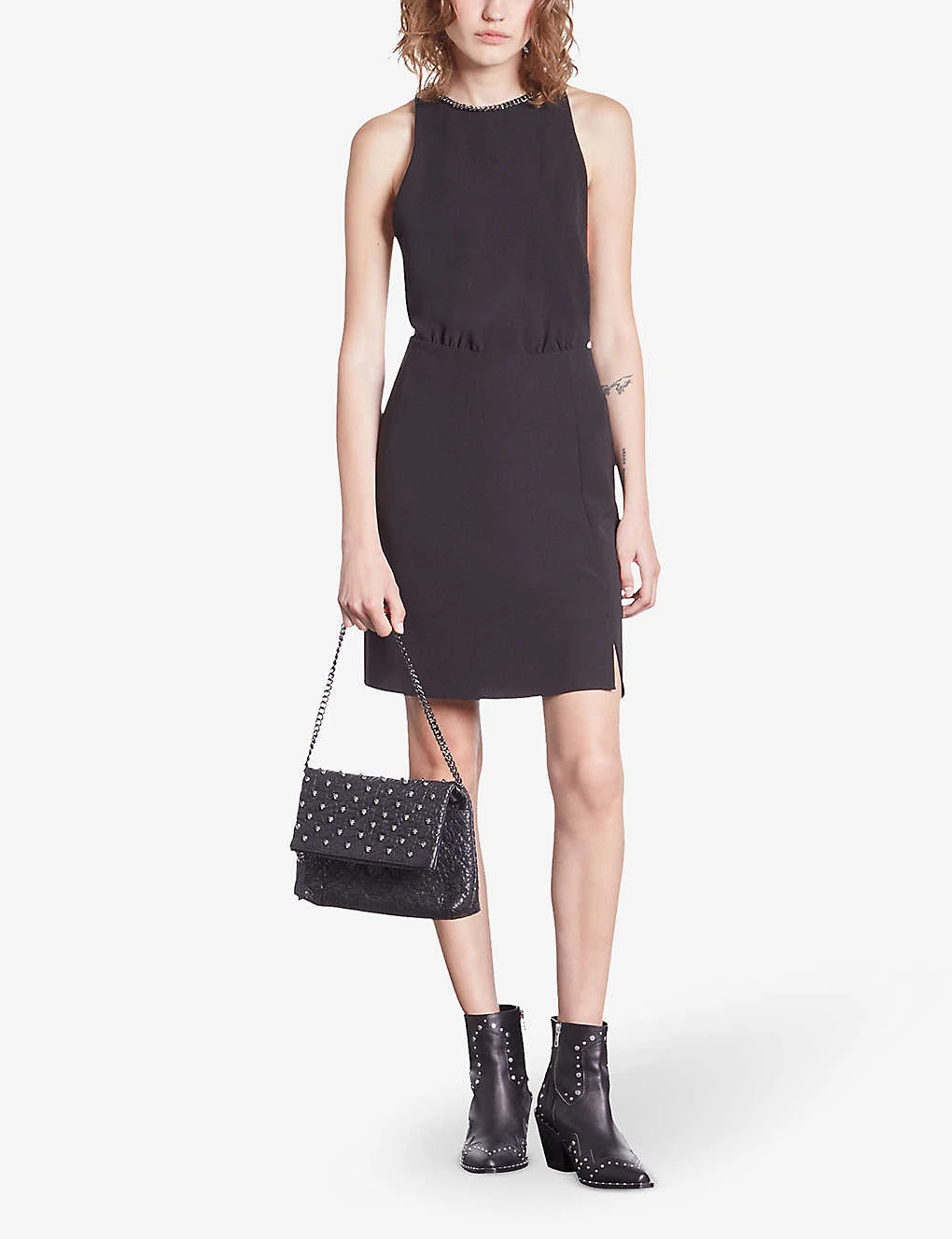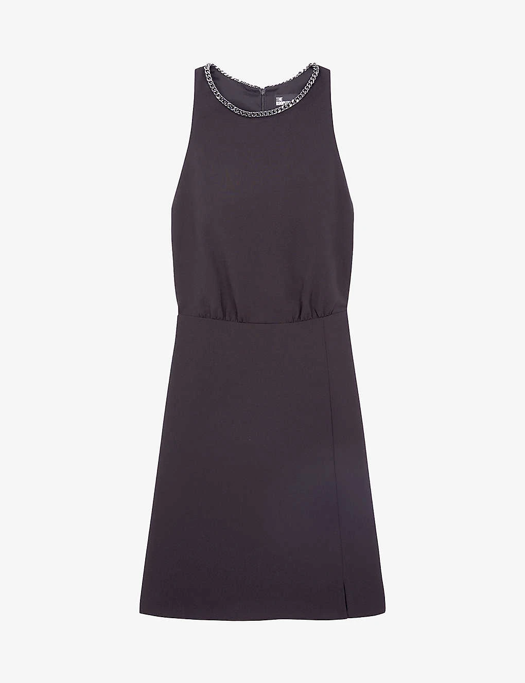 - High neck, sleeveless, chain embellishment at the neck, mini silhouette, slit detail at the skirt
