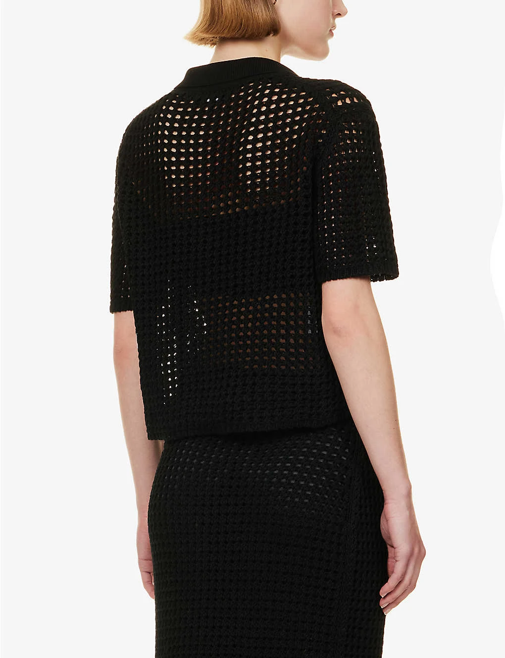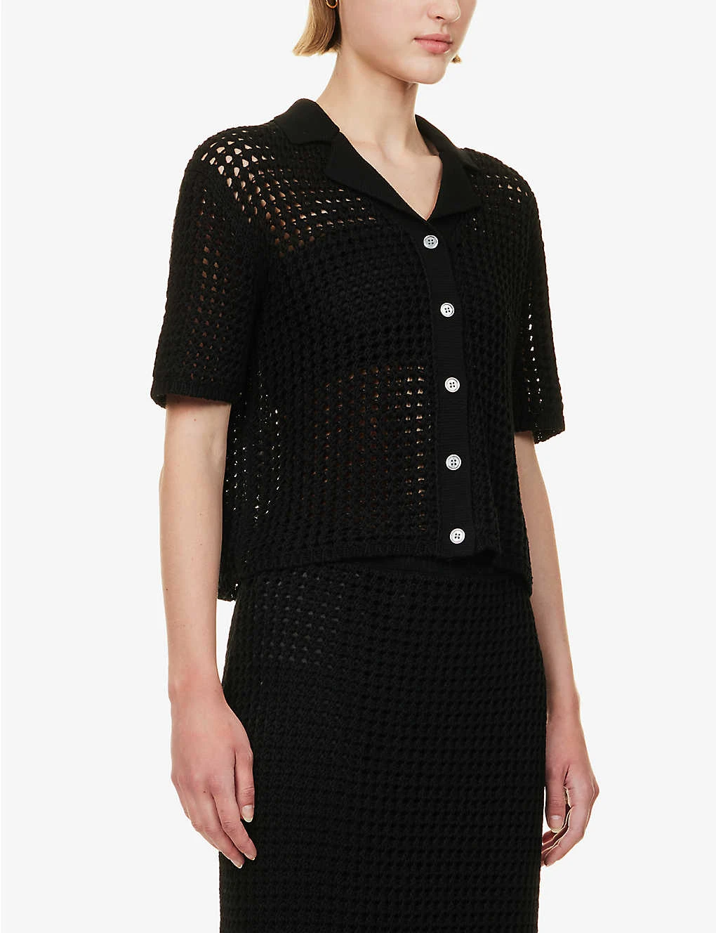 - Relaxed fit, collar, short sleeves, all-over mesh knit pattern, pearlescent buttons