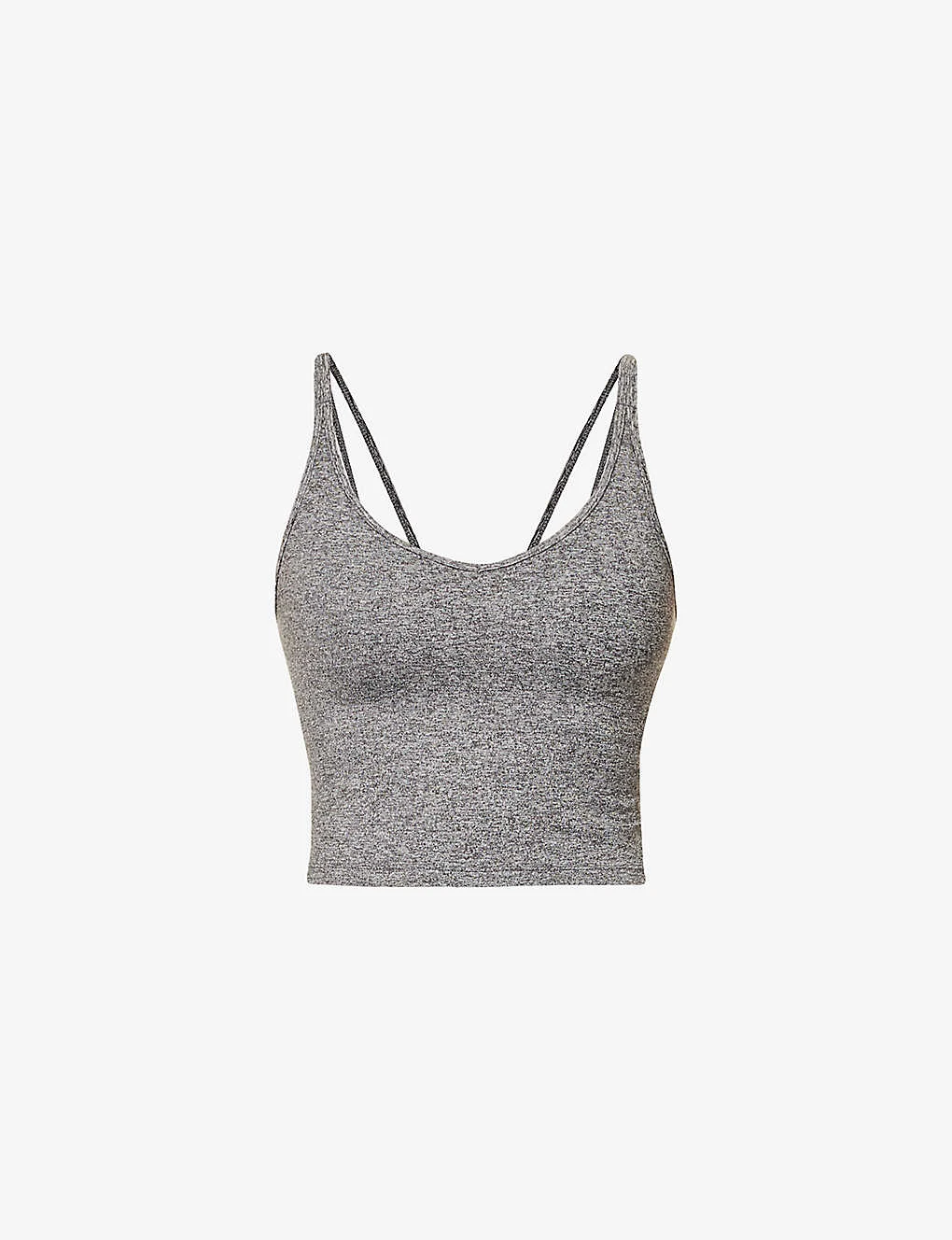 - Fitted, V-neck, shoulder straps, detachable bra padding, branded tab at side, cropped