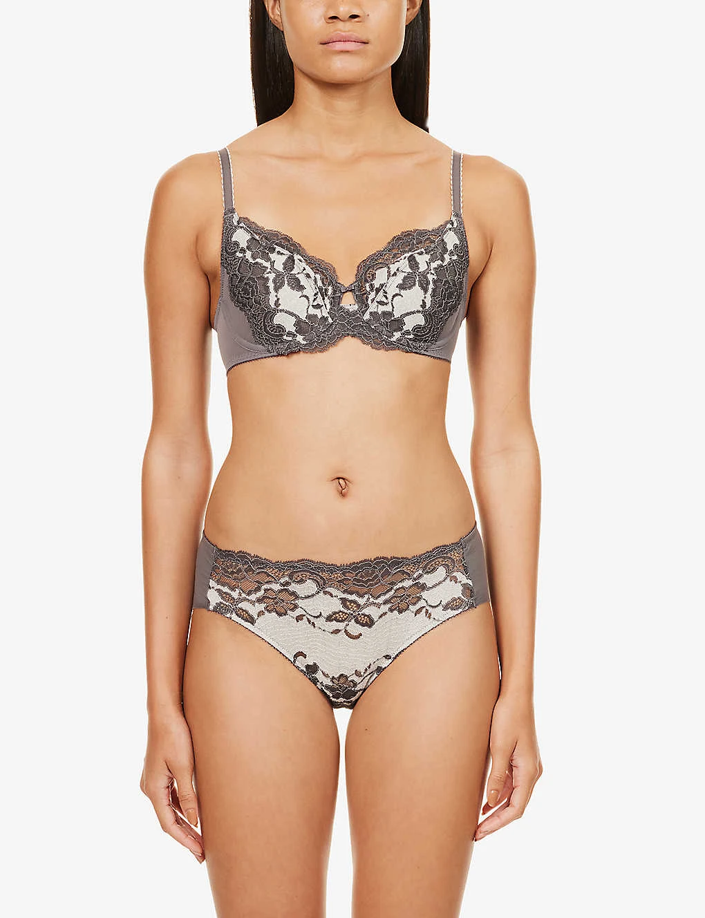 - High rise, contrast lace panel at front, full coverage at back, lined gusset