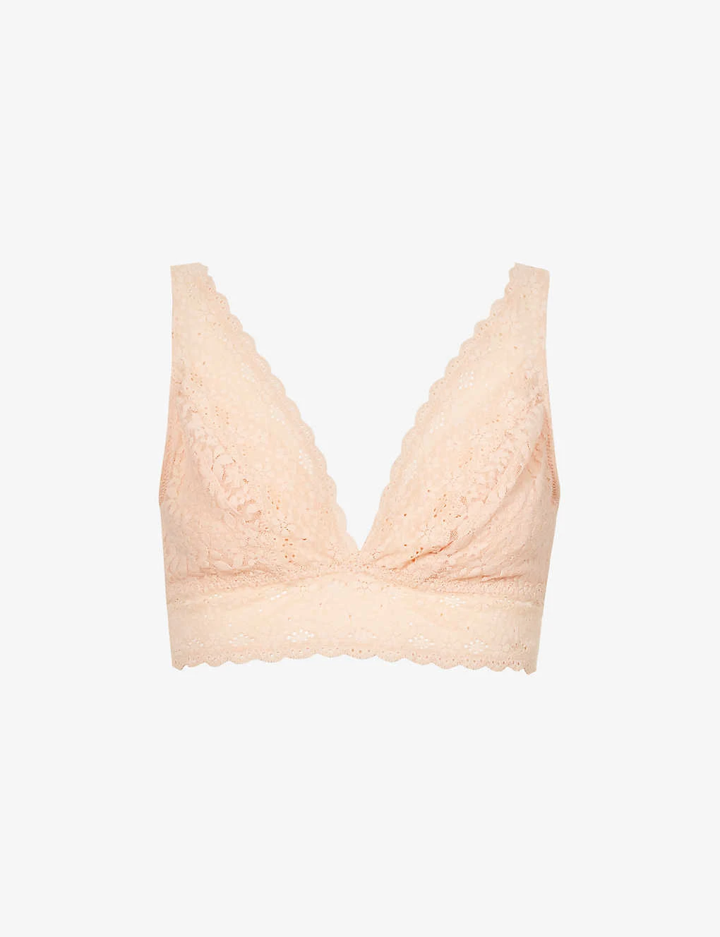 - Triangle cups, soft gathered cups, adjustable straps, elasticated under-band, all-over floral lace pattern, scallop trims