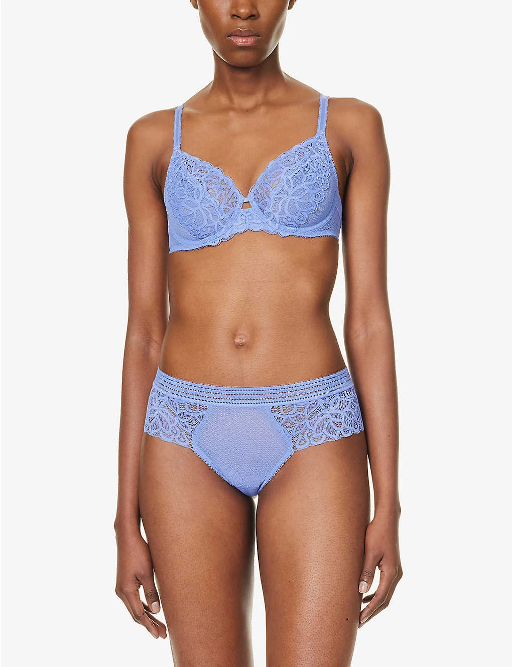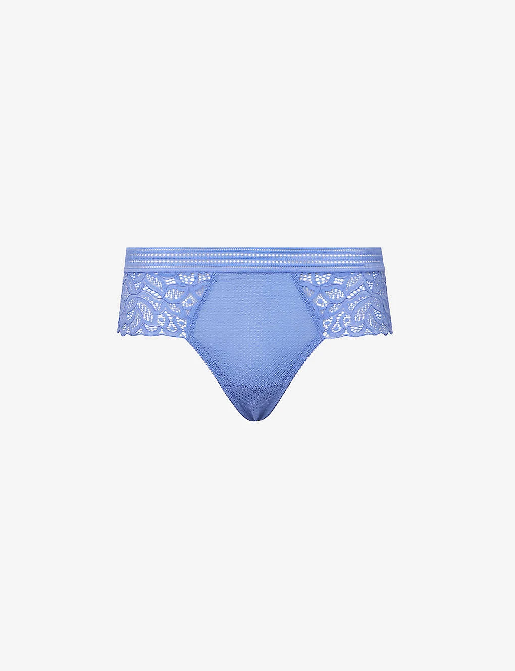 - Regular-fit, mid-rise, elasticated waistband, semi-sheer, all-over lace panels, scalloped trims, V-string at back, lined gusset