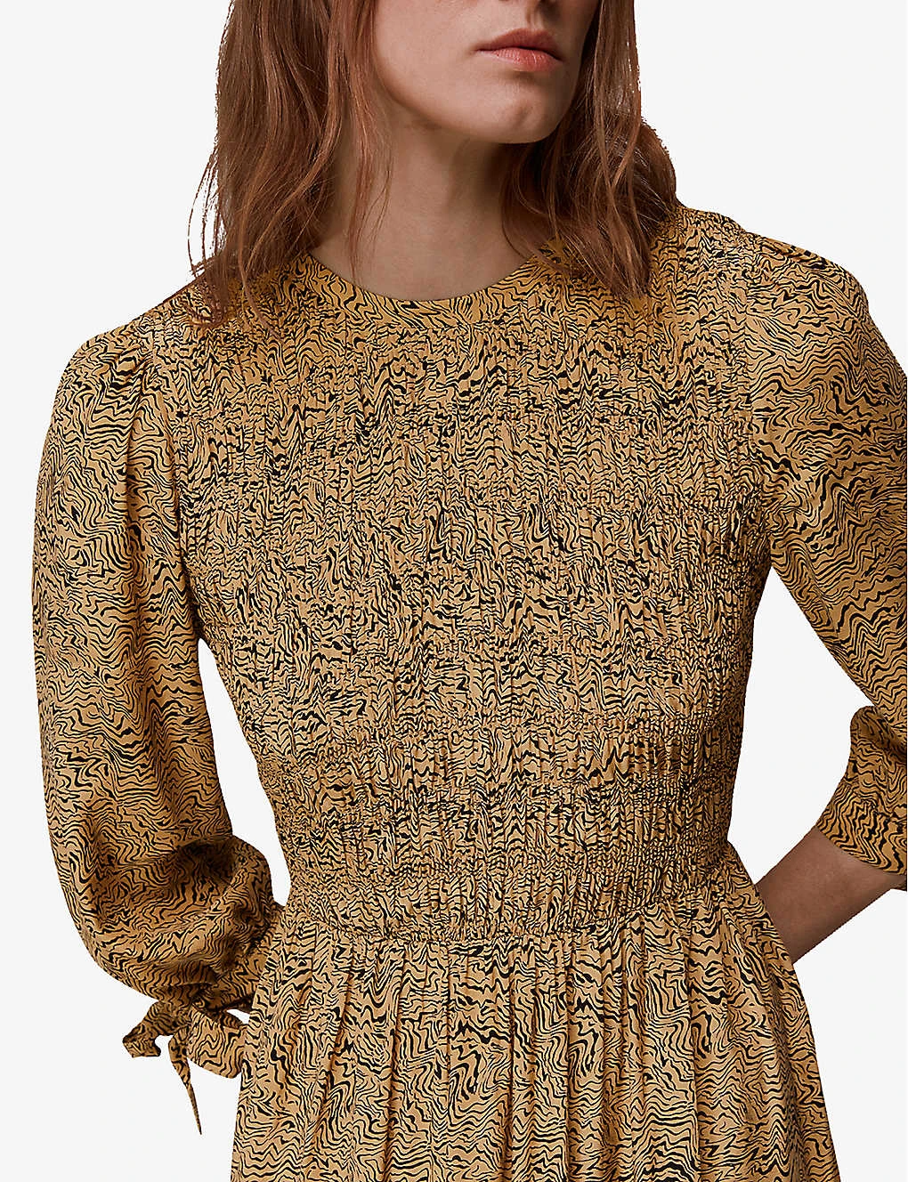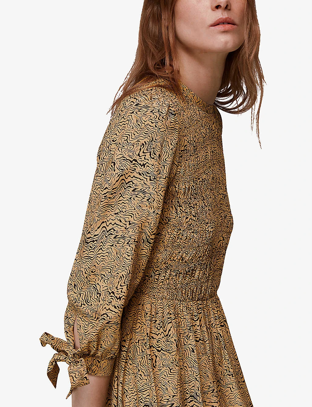 - Midi length, animal print, three-quarter-length sleeves, fitted at the waist, shirred bodice, loose-fitting skirt, round neck, tied cuffs