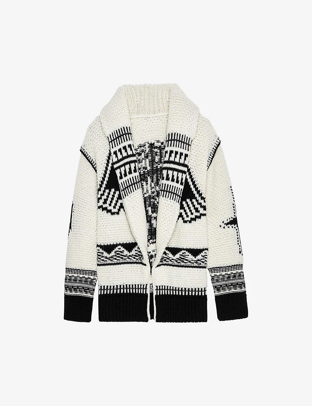- Relaxed fit, shawl collar, long sleeves, all-over intarsia design, all-over knitted fabrication