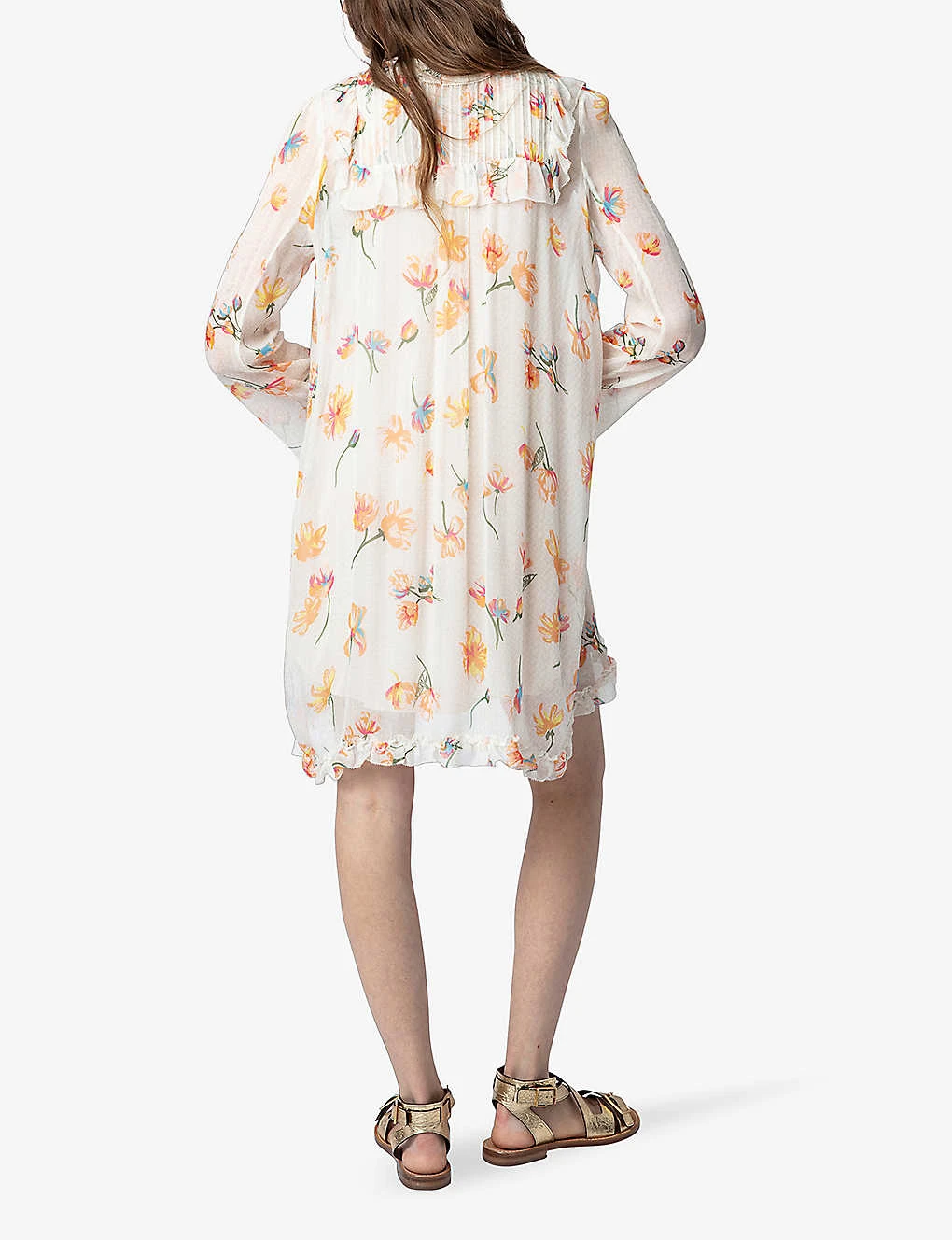 - Round neck, long sleeves, sheer sleeves, frill-cuffs, floral-print throughout, asymmetric hem